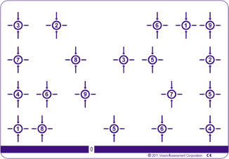 Treatment Vectograph contains four rows of saccadic Fixation Disparity Cross stimuli presented at a 20/100 acuity level, reflective of the visual demands of larger print books. Two-dimensional Fixation Disparity Target stimuli with Number Central Fusion Lock help relate binocular alignment to accommodation (clarity of the target). Total accommodation range is 40 diopters.