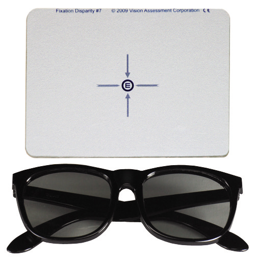 Vectographic 2-dimensional Fixation Disparity Target for assessing Near Point of Fixation Disparity and Associated Vergence Measures at Near. Can be administered in free space or behind a refractor and be presented at a variety of working distances. Includes Doctor Manual and Standard Polarized Viewers.