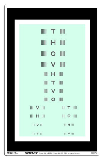Crowded optotypes in the following size equivalents: 20/50, 20/40, 20/30, and 20/20. Includes chart, response key, switch box overlay, and instructions. 9" x 14" (22.9 cm x 35.6 cm).