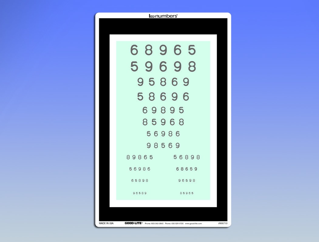 Linear-spaced optotypes in the following size equivalents: 20/63, 20/50, 20/40, 20/32, 20/25, 20/20, 20/16, and 20/12.5. Two lines of each size with 5 optotypes on each line. Includes chart and switch box overlay. Included with 915000 Complete LED Insta-Line Quantum™. 9" x 14" (22.9 cm x 35.6 cm).