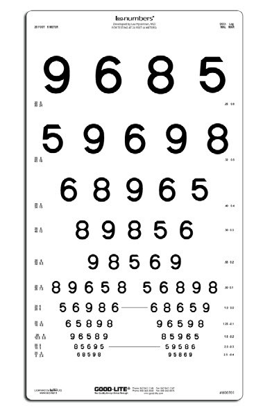 Proportionally spaced (logMAR) lines; line sizes range from 20/80 to 20/8 (6/24 to 6/2.4) equivalent, 0.25 to 2.50.