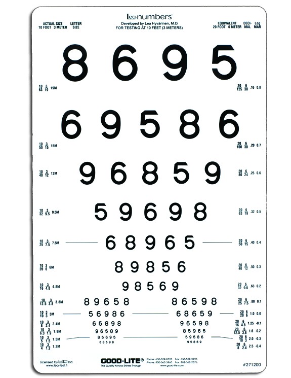Proportionally spaced (logMAR) lines; line sizes range from 20/125 to 20/8 (6/38 to 6/2.4) equivalent, 0.16 to 2.50.
