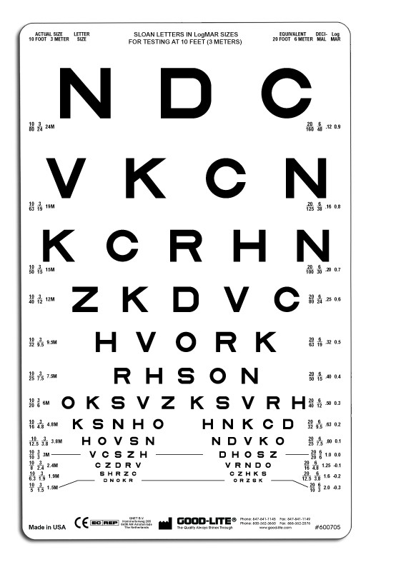 Proportionally spaced (logMAR) lines; line sizes range from 20/160 to 20/10 (6/48 to 6/3) equivalent, 0.12 to 2.00.