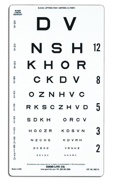 Linear-spaced lines; line sizes range from 20/160 to 20/16 (6/48 to 6/4.8) equivalent, 0.12 to 1.25.