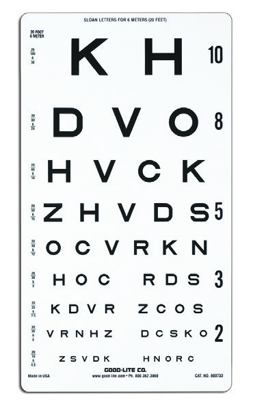 Linear-spaced lines; line sizes range from 20/100 to 20/16 (6/30 to 6/4.8), 0.20 to 1.25.