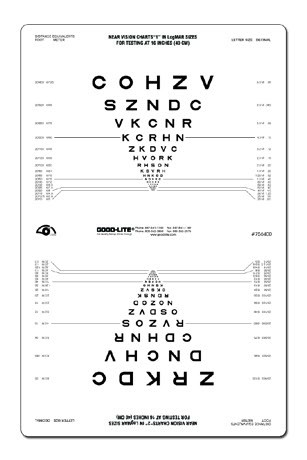 Proportionally spaced (logMAR) lines; line sizes range from 20/400 to 20/10 (6/120 to 6/3) equivalent. Chart fits in Quantum Series, Model A+, and Model A illuminated cabinets. Chart size is 9" x 14" (22.9 cm x 35.6 cm). 16" (40 cm) testing distance.
