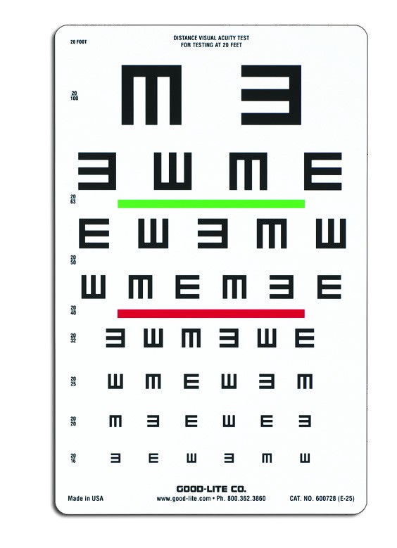 Wide-spaced lines; line sizes range from 20/100 to 20/16 (6/24 to 6/4.8), 0.20 to 1.25. Lines are labeled with 20' notations only.
