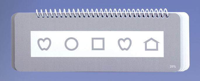 Test for quick measurement of low contrast visual acuity at 25%, 10%, 5%, 2.5%, and 1.25% contrast by measuring the distance where the symbols are seen.