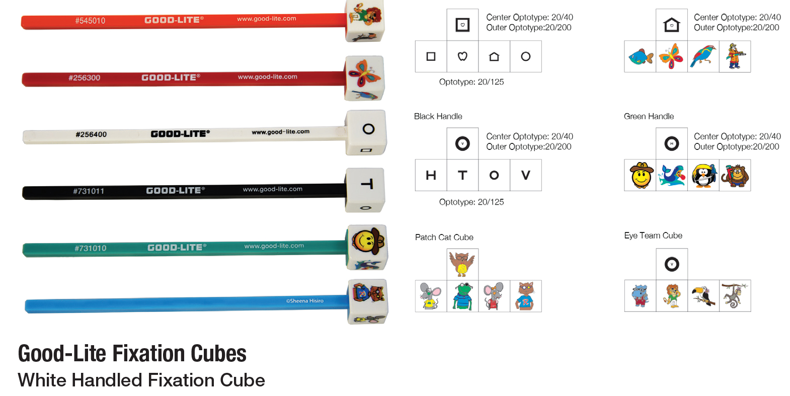 LEA SYMBOLS® fixation cube with white handle has a center optotype calibrated to 20/40 (6/12) and an outer optotype calibrated to 20/200 (6/60) equivalent when tested at 16" (40cm) on top of cube. The optotypes on side of cube are calibrated to 20/125 (6/38) equivalent.