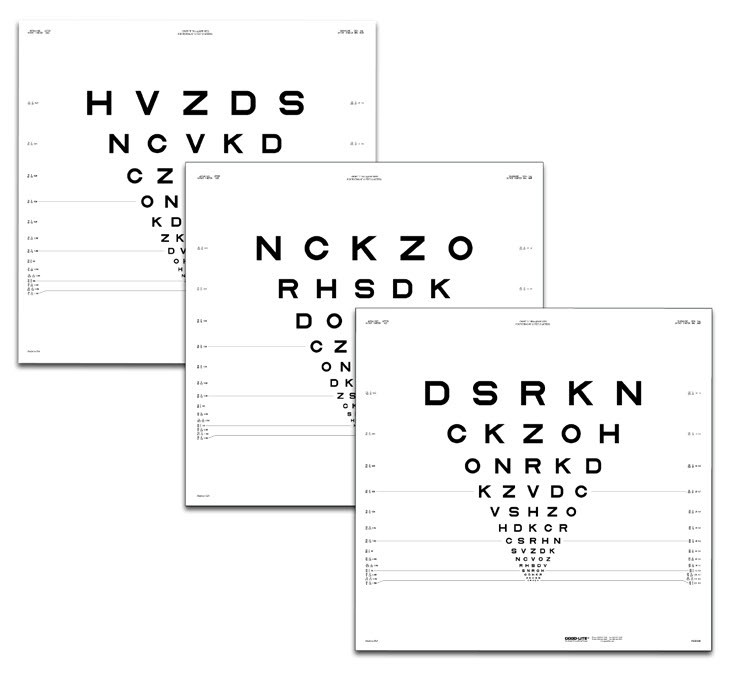Proportionally spaced (logMAR) lines; line sizes range from 20/200 to 20/10 (6/60 to 6/3) equivalent, 0.10 to 2.00. Revised version of the original ETDRS series based on more recent research.