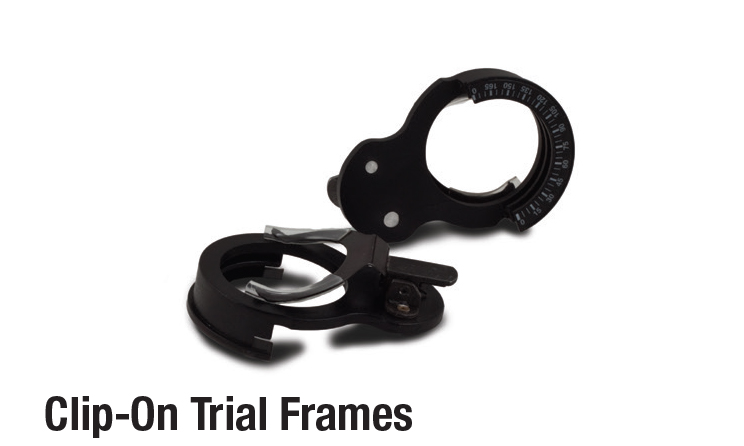 Once the patient’s distance Rx is correct, clips can help check presbyopic addition. Axis markings provided for use with cylinders.