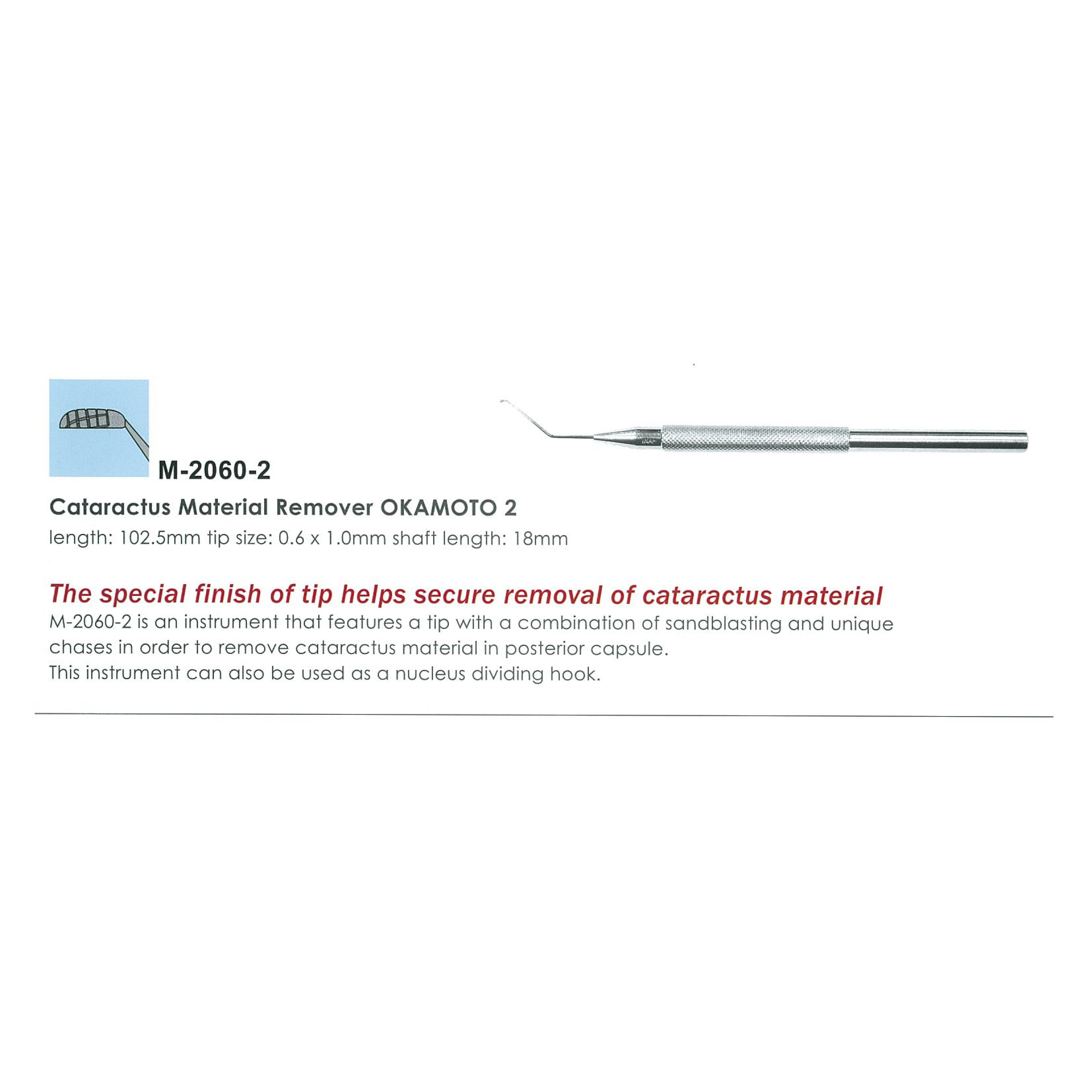 M-2060-2 is an instrument that features a tip with a combination of sandblasting and unique chases in order to remove cataractus material in posterior capsule.