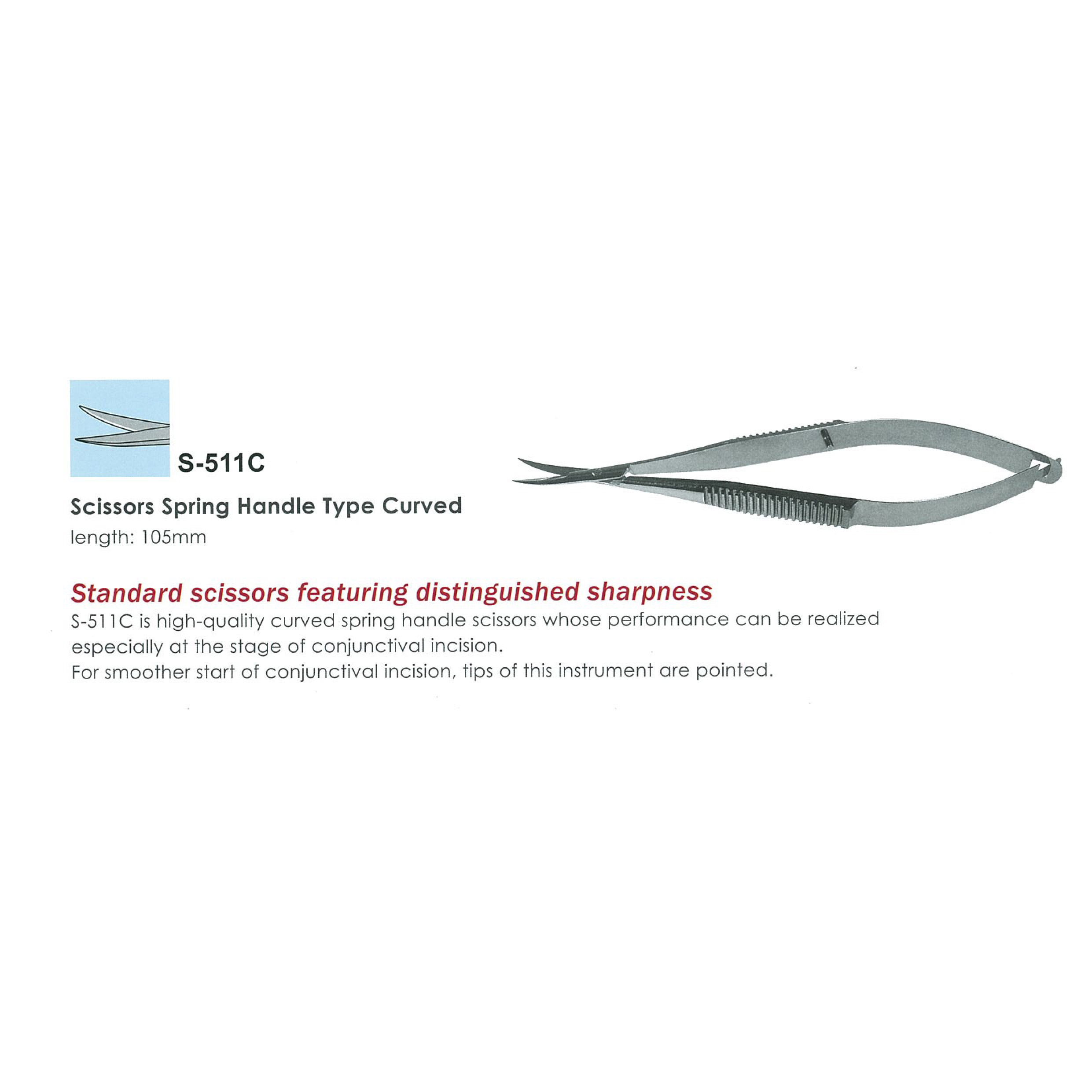 S-511C is high-quality curved spring handle scissors whose performance can be realized especially at the stage of conjunctival incision.
