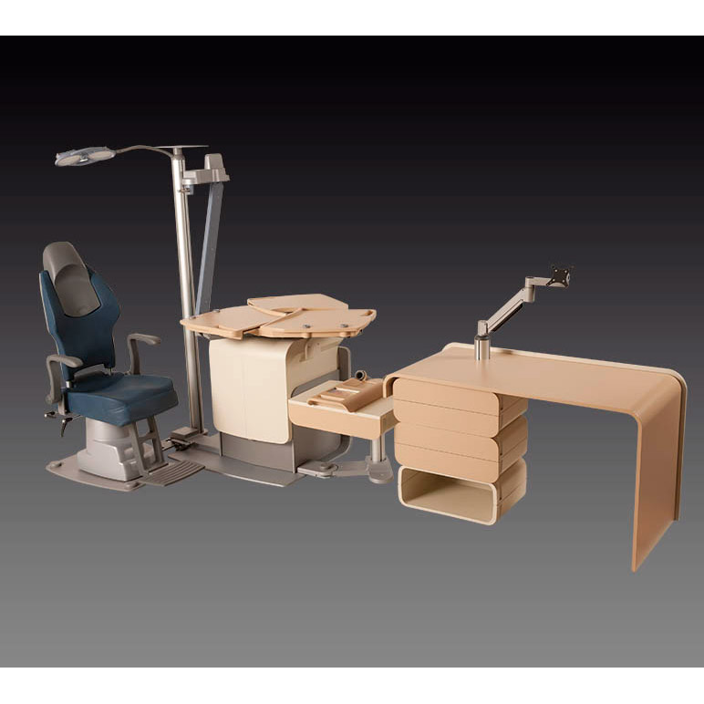 TECHNICAL DATA Refraction unit with manual rotary table for 3 instruments and manual working position - electric up/down movement of the instruments table and rotation system for patient chair - table locking system in any position - 4 different control panel consoles with touch-screen keyboard: "compact" no drawer (code 10.330.10), "elegance" with 1 drawer and trial lens tray (code 10.330.11), "highline" with 3 drawers and trial lens tray (code 10.330.13) and "mix" with 1 drawer, trial lens tray and open compartment (code 10.330.15). Column with adjustable LED lamp and projector support. Patient chair with electric up/down movement.