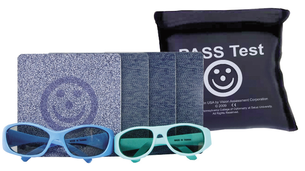 Preschool Assessment of Stereopsis with a Smile (PASS) - Stereoacuity test for quantitative assessment of stereopsis in children and non-readers. Includes: 6 Cards (480, 240, 120, 60, Demo, and Blank) with Carrying Case, 1 Pair Pediatric Polarized Viewers, and 1 Pair Intermediate Polarized Viewers.