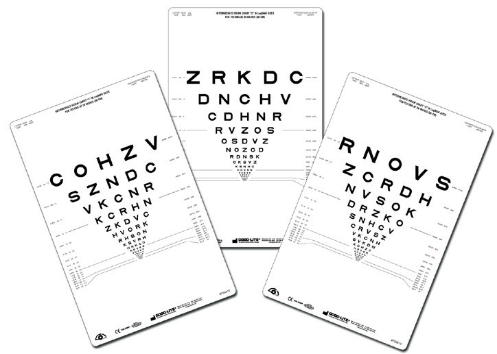 Charts calibrated to test visual acuity at an intermediate distance of 31" (80 cm) or 26" (66 cm). Charts are available in 3 different scrambled versions for repetitive testing situations. Sloan Letters optotype with proportionally spaced lines; line sizes range from 20/400 to 20/10 (6/120 to 6/3) equivalent. Notations for Letter Size, Decimal, and logMAR are also on the chart. Chart fits in Quantum Series, Model A+, and Model A illuminated cabinets. Chart size is 9" x 14" (22.9 cm x 35.6 cm). 31" (80 cm) testing distance.