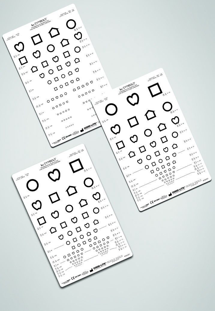 Linear-spaced lines; line sizes range from 20/100 to 20/16 (6/30 to 6/3) equivalent, 0.20 to 1.25. Set includes response key and instructions.