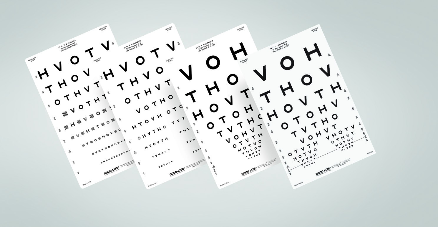 Proportionally spaced (logMAR) lines; line sizes range from 20/125 to 20/8 (6/38 to 6/2.4) equivalent, 0.16 to 2.50. Set includes chart, response key and instructions.