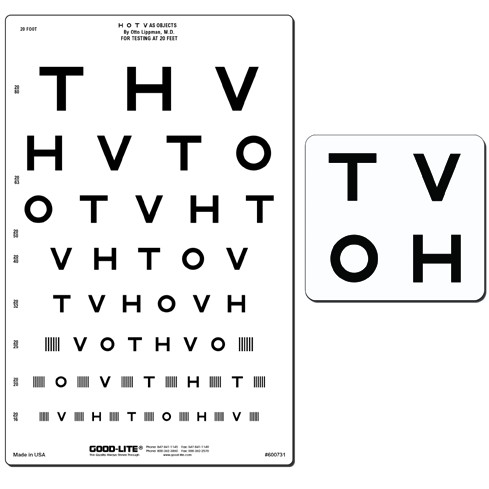 Crowded lines; line sizes ranging from 20/80 to 20/16 (6/24 to 6/4.8), 0.25 to 1.25 . Set includes chart, response key and instructions.
