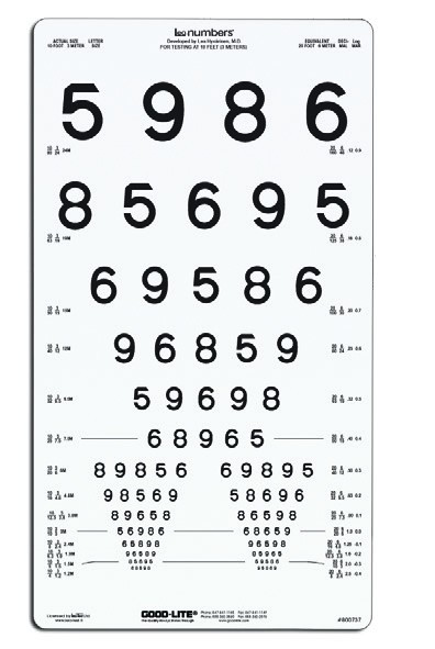 Proportionally spaced (logMAR) lines; line sizes range from 20/160 to 20/8 (6/48 to 6/2.4) equivalent, 0.12 to 2.50.
