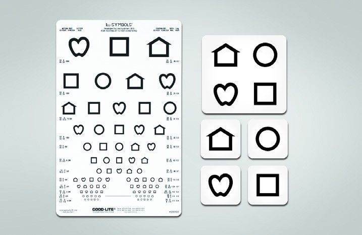 Proportionally spaced (logMAR) lines; line sizes range from 20/100 to 20/8 (6/30 to 6/2.4) equivalent, 0.20 to 2.50. Set includes response key and instructions.