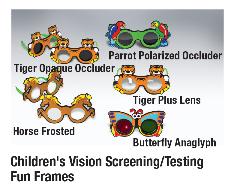 Who said serious tests had to be done with boring test glasses? Add fun to your pediatric tests with our animal motif frames. Use these fun frames as occluders to increase testability, as pinhole occluders or hyperopia glasses, and during tests requiring anaglyph or polarized glasses, such as tereoacuity tests. Occluders come in left and right pairs with the same frame style. These covered frames are more colorful than shown here and they are surprisingly durable! Not for possession by children below age 3.