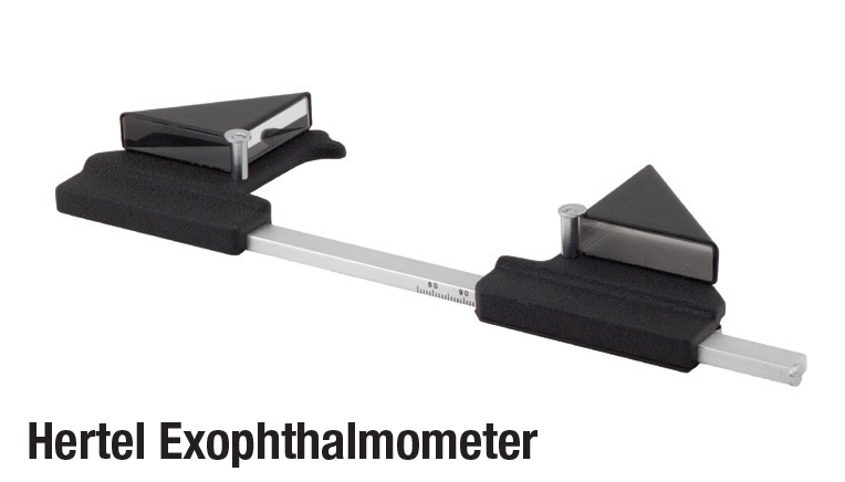 This instrument is used for precise exophthalmos measurements (e.g.,exophthalmic goiter). The basis of the measurement for exophthalmos determination using the Hertel version is the outer orbital rim (orbital wall) and the apex of the cornea. The integral refraction mirrors with millimeter scales for the lefthand and right-hand measuring halves of the exophthalmometer are calibrated so that the zero mark on the scale will be located in the plane of the resting points of the supports. For exophthalmus measurements the supports are placed against the two temporal orbital walls so that the orbital rim contacts the deepest point of the supports.
