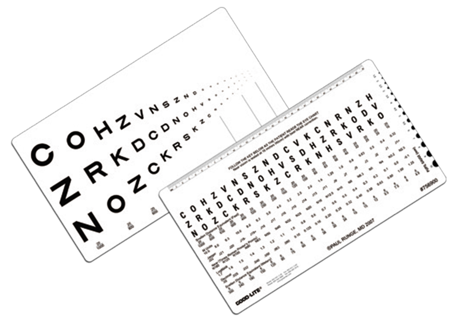 This easy-to-use low vision card was developed to mimic reading from left to right. Printed answers on back of card allows the tester to follow the patient's testing results. The back includes Snellen, meters, decimal, logMAR, font size, Jaegar, and M unit notations. A ruler and pupil gage is also included.