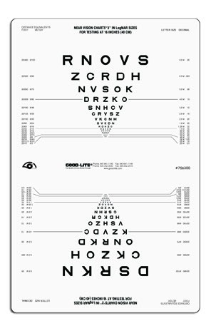 Proportionally spaced (logMAR) lines; line sizes range from 20/400 to 20/10 (6/120 to 6/3) equivalent. Chart fits in Quantum Series, Model A+, and Model A illuminated cabinets. Chart size is 9" x 14" (22.9 cm x 35.6 cm). 16" (40 cm) testing distance.