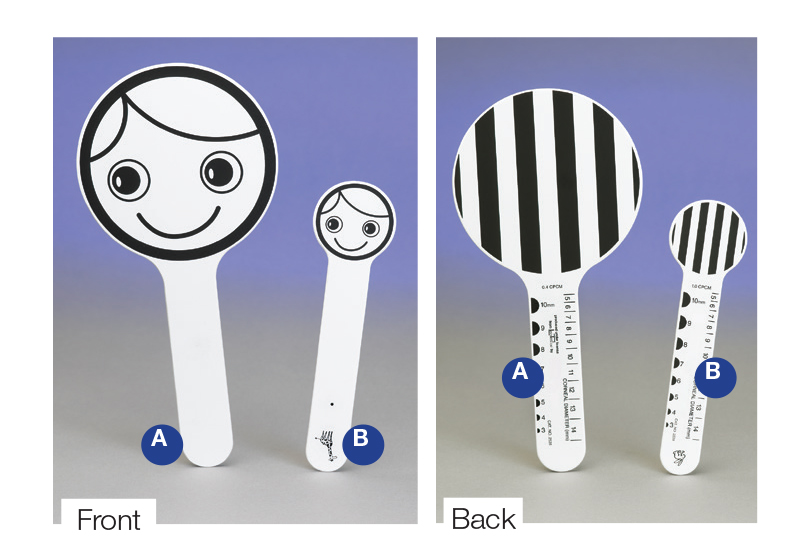 The small 2" (5 cm) diameter “smiling face” fixation paddle was developed based on studies by Robert Fanz. Features include grating on reverse side for preferential looking, small pictures of a bunny and a giraffe on end of stick for fixation, and marks for measuring pupil size and corneal diameter measurement on the handle.