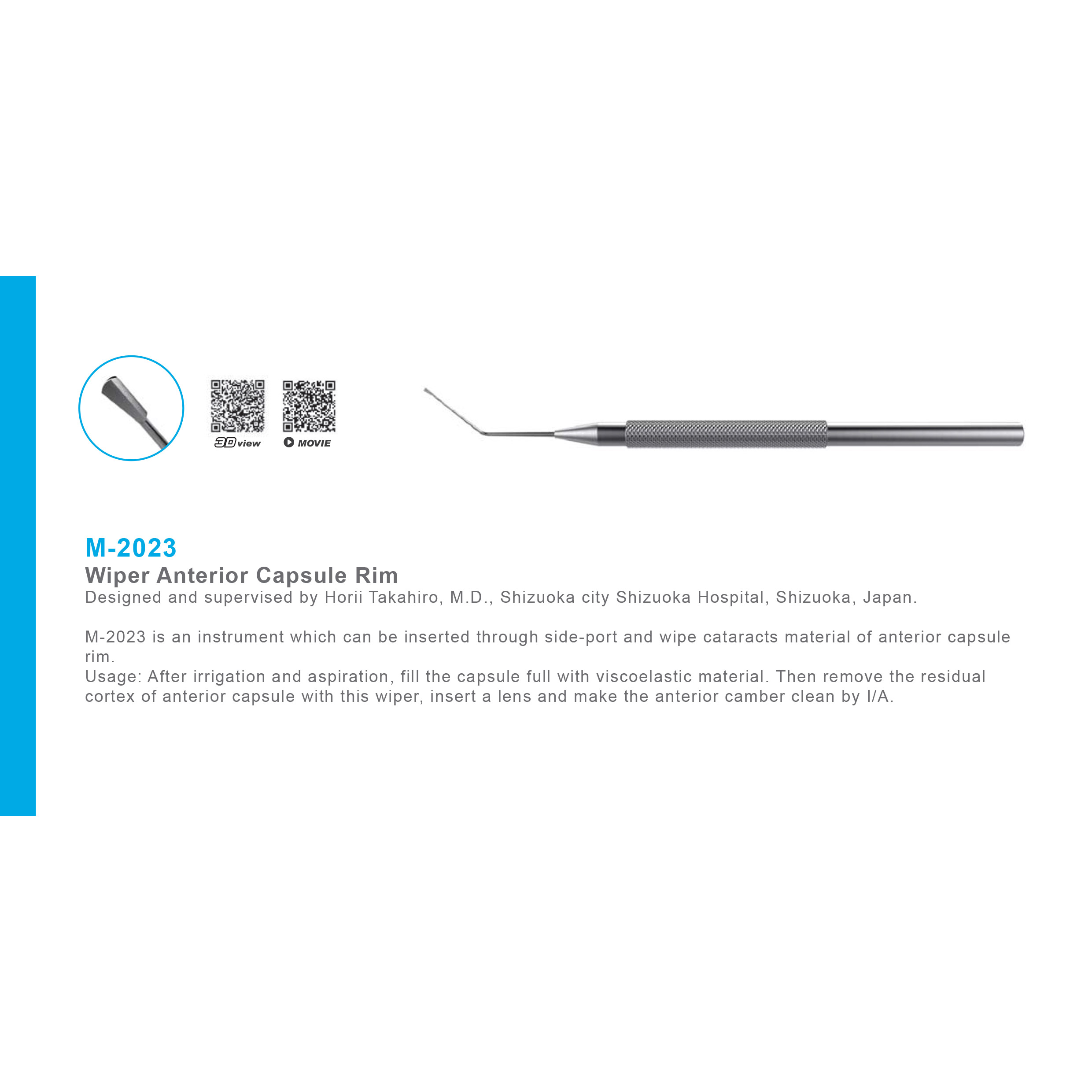 M-2023 is an instrument which can be inserted through side-port and wipe cataracts material of anterior capsule rim.